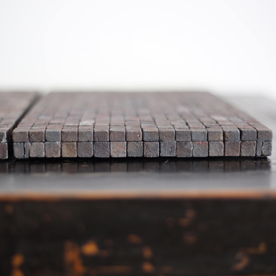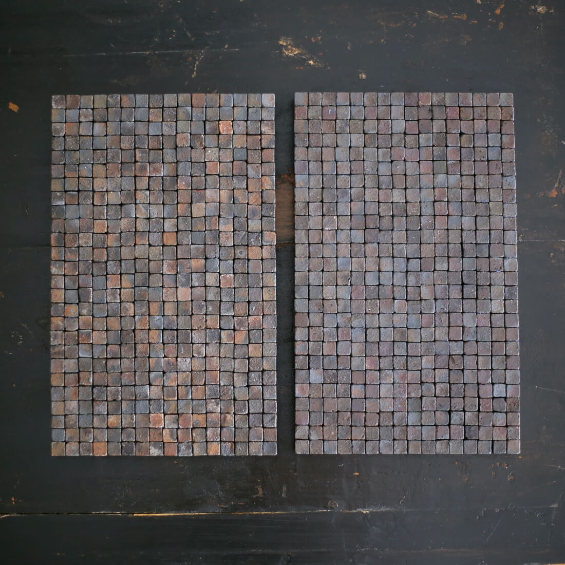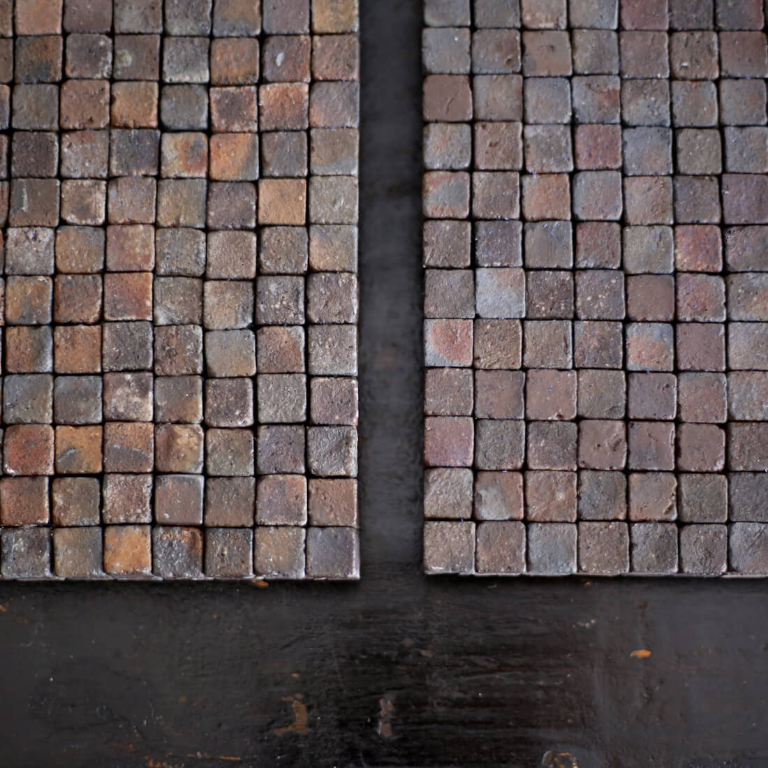 当初は再生粘土の焼き色テストが目的だったが、手に入る屑土を受け入れ自らの素材選択を放棄したことで無数に採れる「ゆらぎ・ブレ」の