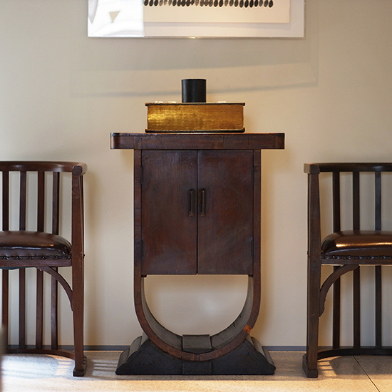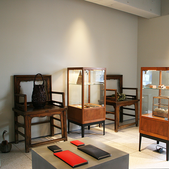 上海家具以外には、高い品質を誇るデンマークのブランドの黒革張りのソファ、約100年前に日本の郵便局で使われていたというデザインの籠椅子。