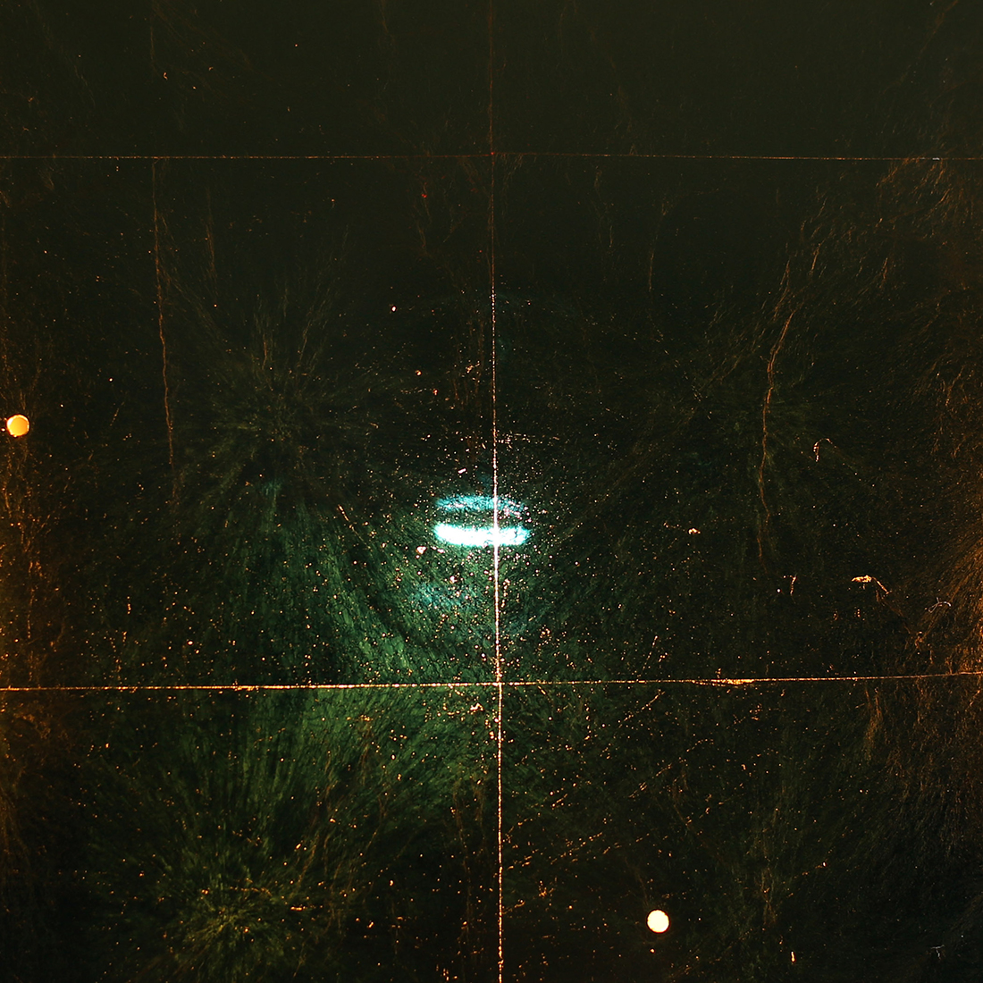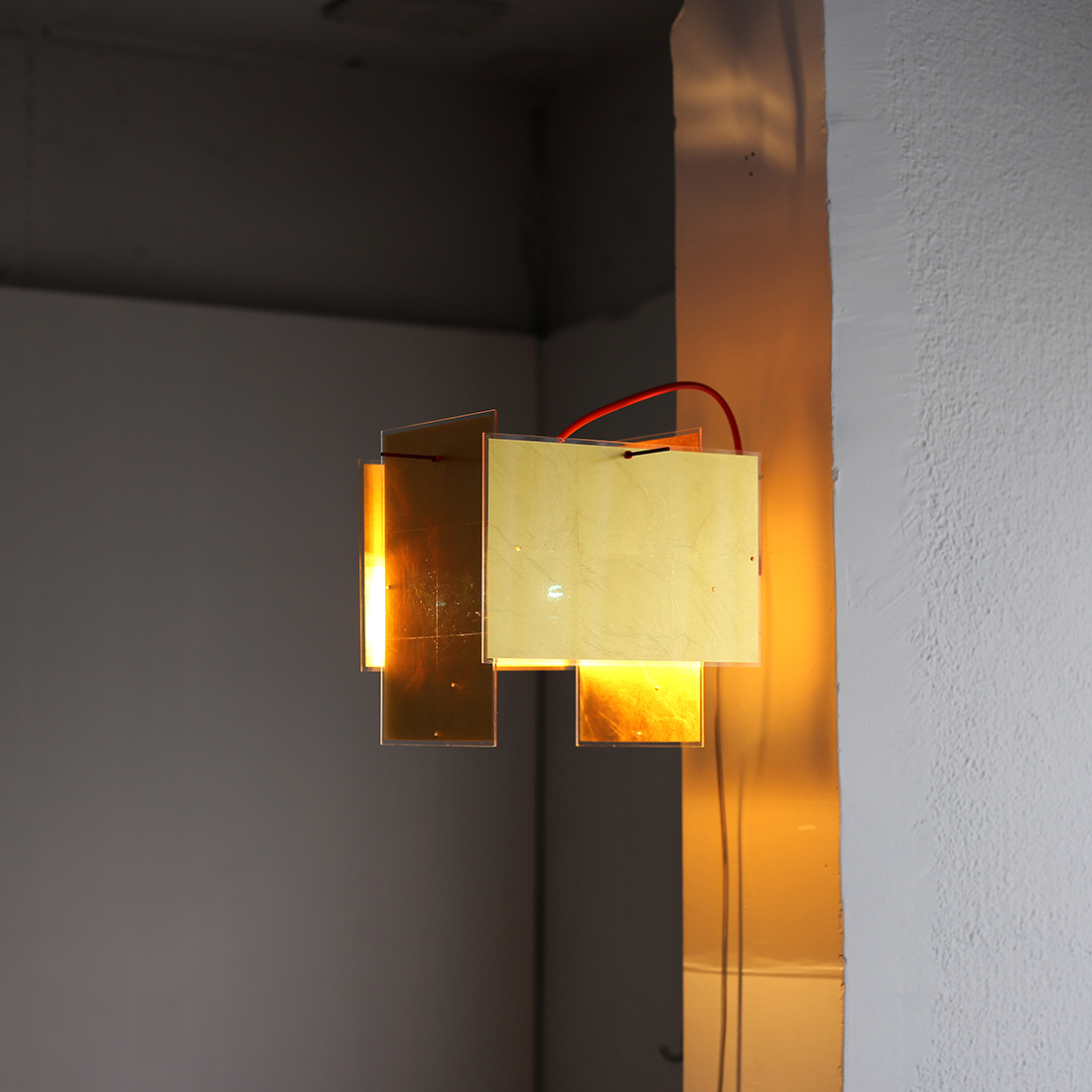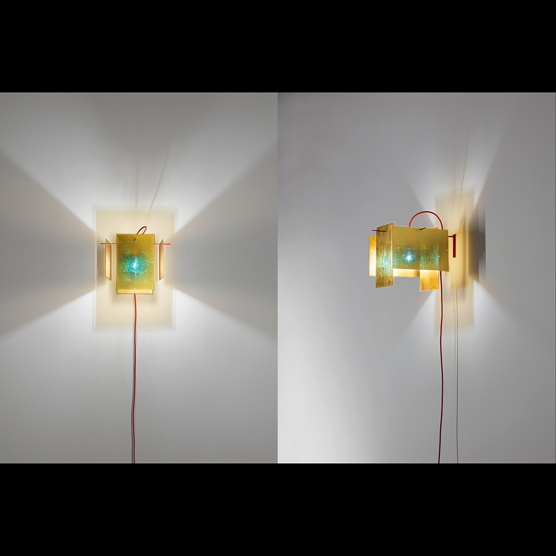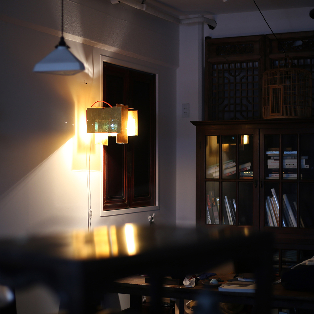 白熱球の光を1/10mmの厚さになるまで叩いて延ばされた金箔に透過させると、波長の短い青い光になる。そして柔らかな金色の光はアクリルシェードの中で反射し、美しい空間を演出する。