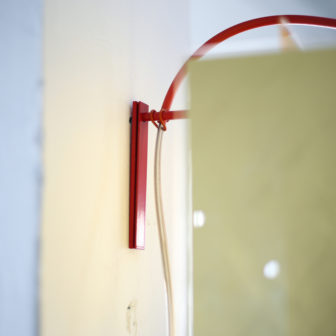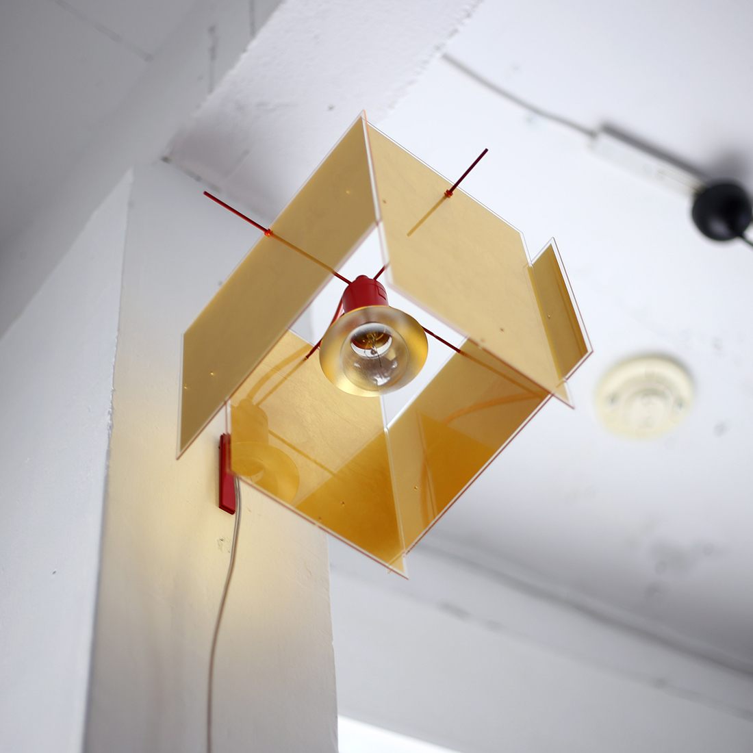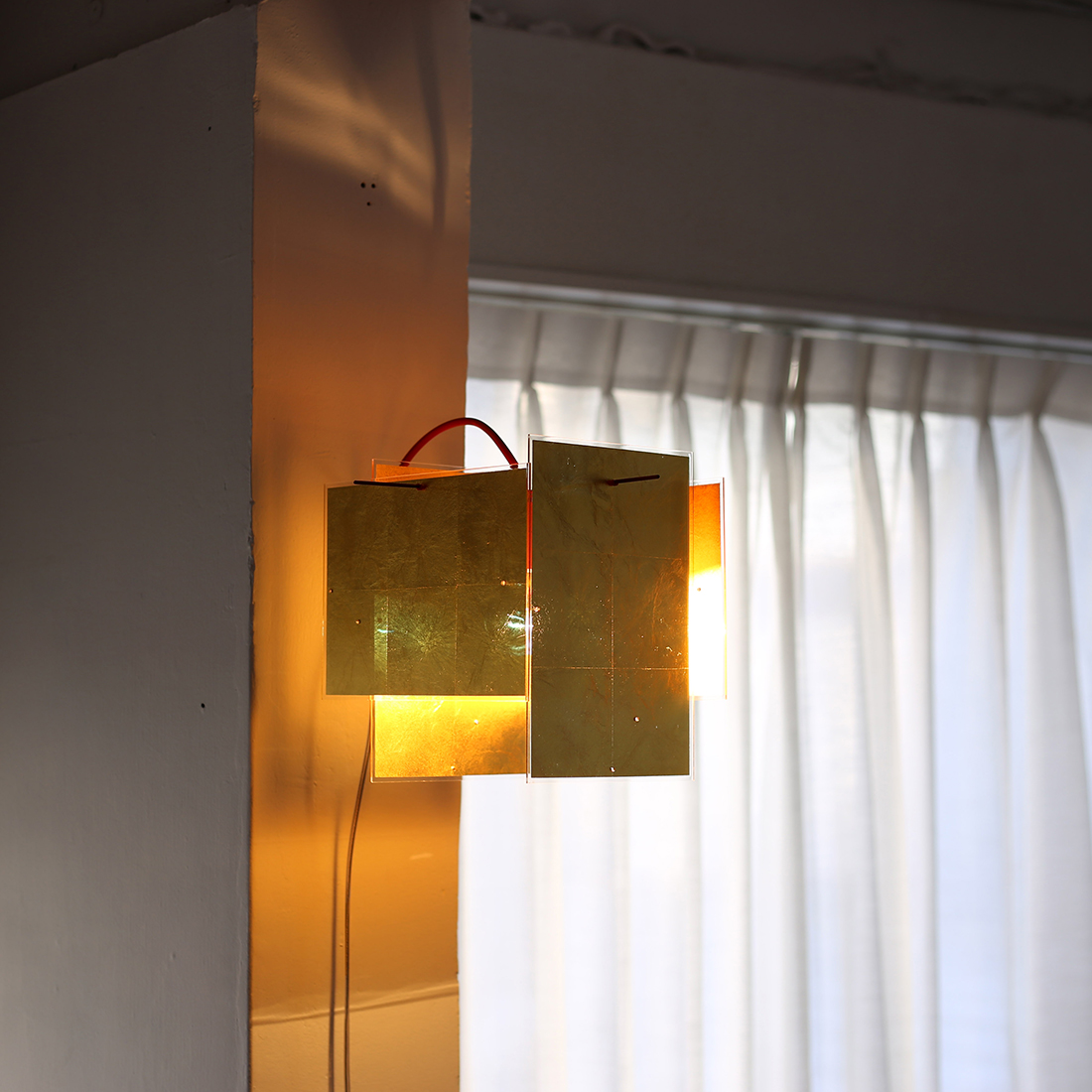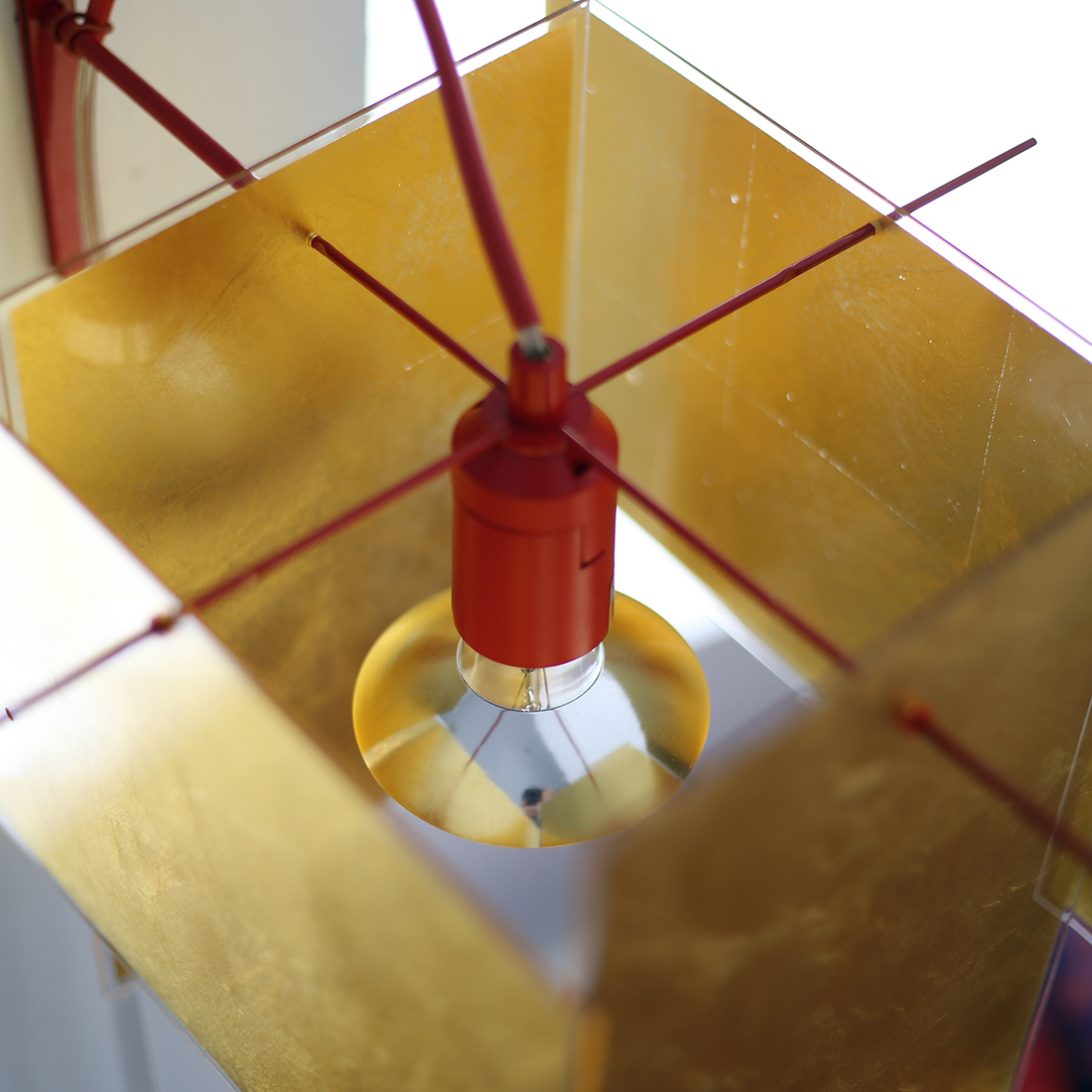 金箔を挟んだアクリルシェードはフレームを通す穴の位置を変えることで様々な角度で吊るすことができる。