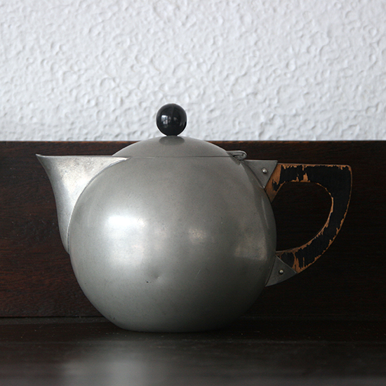 まんまるのフォルムに直線的な注ぎ口や持ち手のライン。アールデコ調のデザインだと思われます。持ち手は木製で、塗装の風合いは格別なものがあります。ティーポット、シュガーポット、クリーマー、カップの4点セットで、もちろん、実際にお使いいただけます。